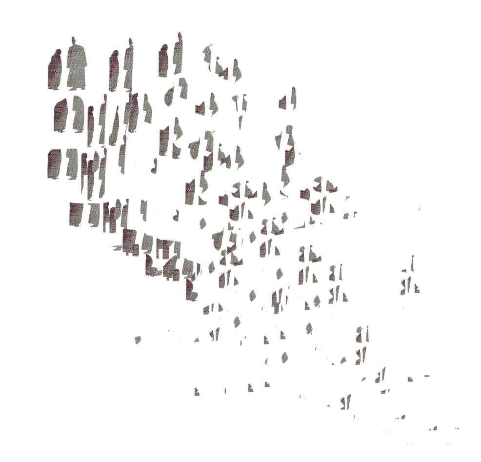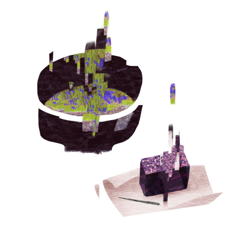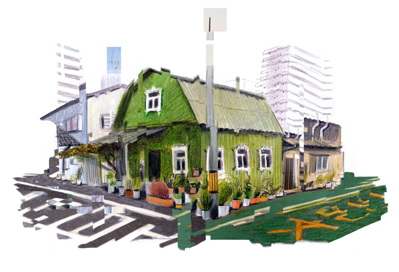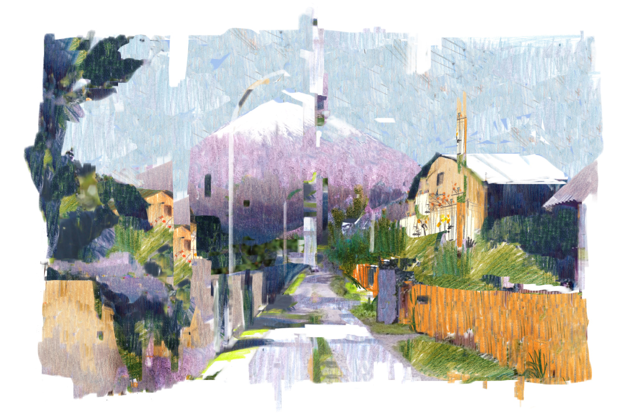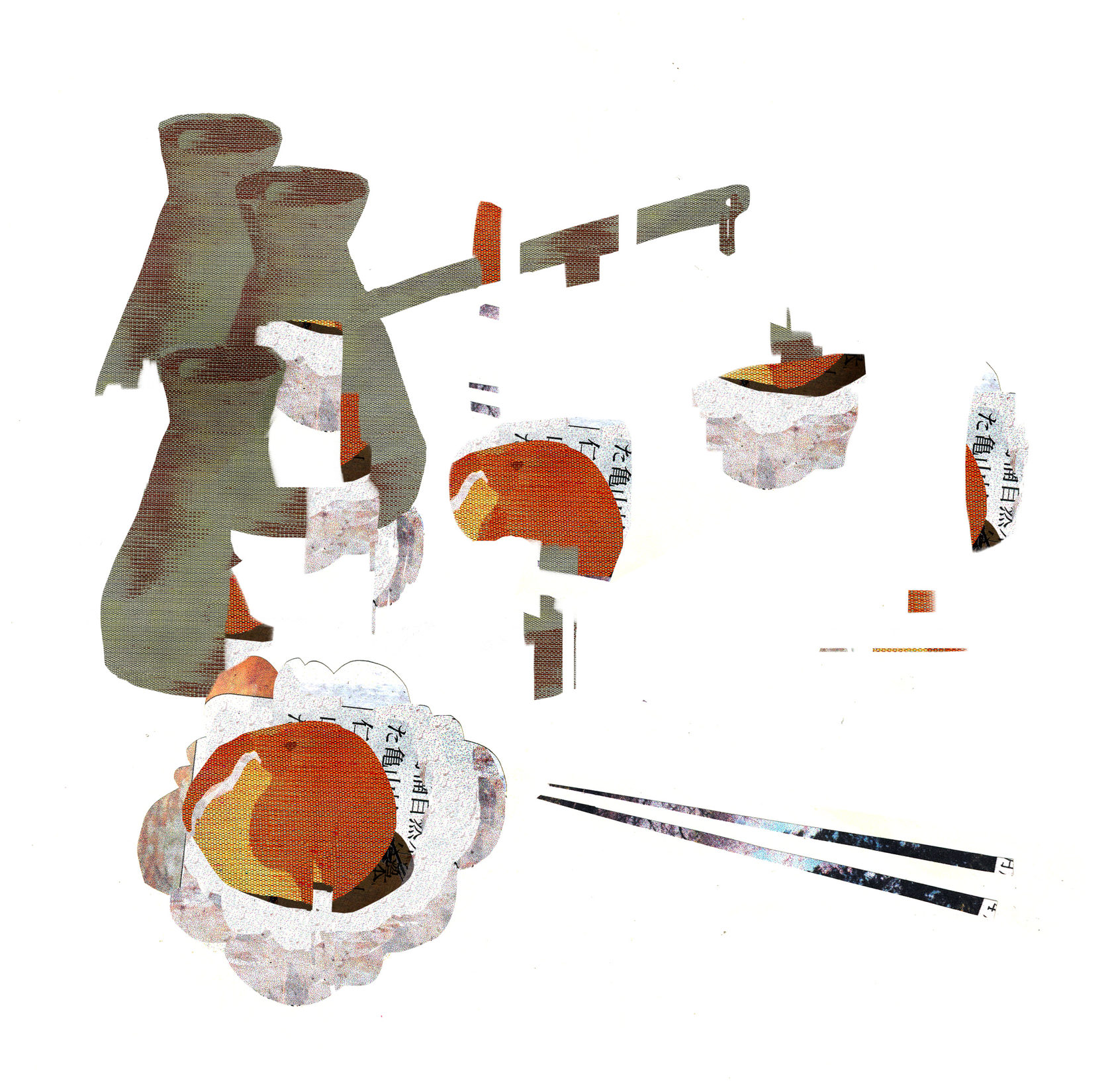 «Эта серия коллажей собрана спустя полтора года после того, как я была в Камэока — собрана из сделанных в резиденции фотографий, набросков, фрагментов ткани старых кимоно и газет с чердака Омоя, и скомбинирована с нынешними и более старыми набросками по памяти. Эти рисунки — рассыпающийся набор воспоминаний, стереотипов и где-то увиденных образов.»