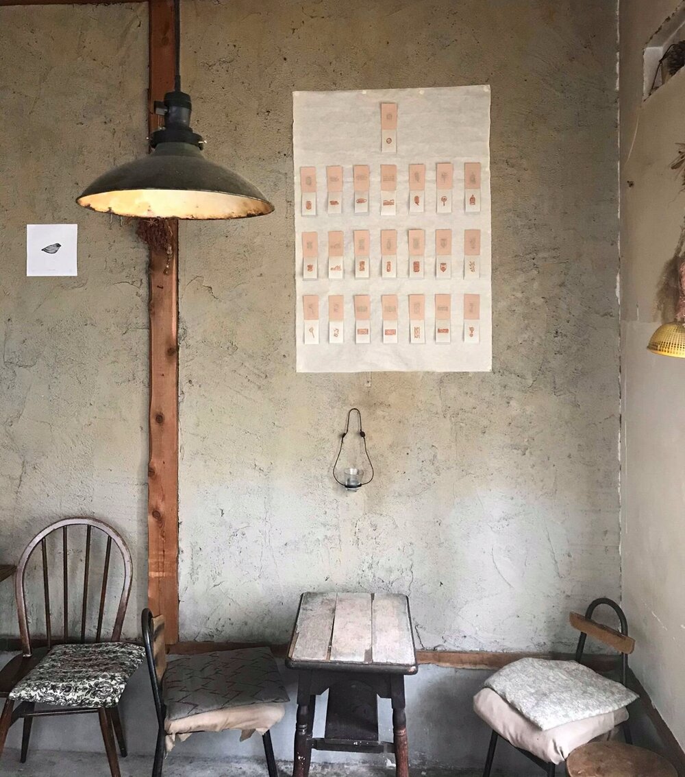 Материалы: мини-принты из резиновых штампов на переработанном картоне, японской бумаге васи из Арасияма и крафте из Киото. Выставлены в кафе